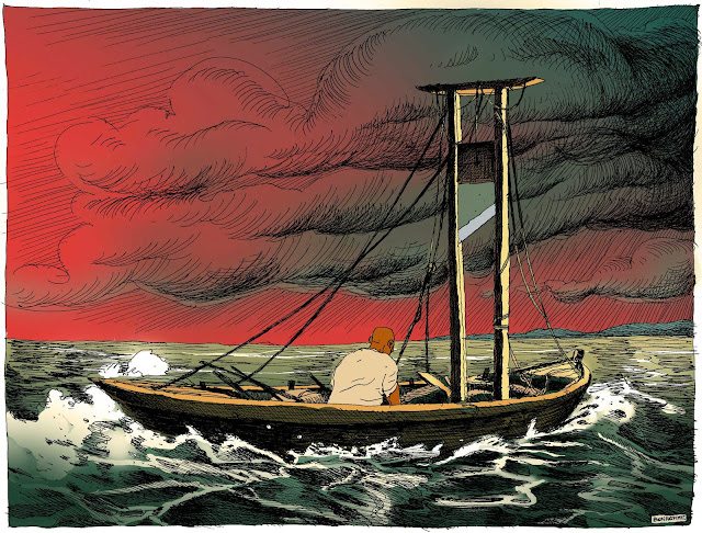 Salut ! Voila une illustration réalisée pour le quotidien Le Monde du 06 octobre 2013. Le sujet était libre et j'ai choisi de parler du drame de Lampedusa, avec un dessin assez énigmatique et surréaliste un peu à la manière de "L'île des morts" de Böcklin. Une barque voguant sous des cieux rouge-sang vers un destin fatidique provoqué par la bêtise et l'inaction des hommes "civilisés".